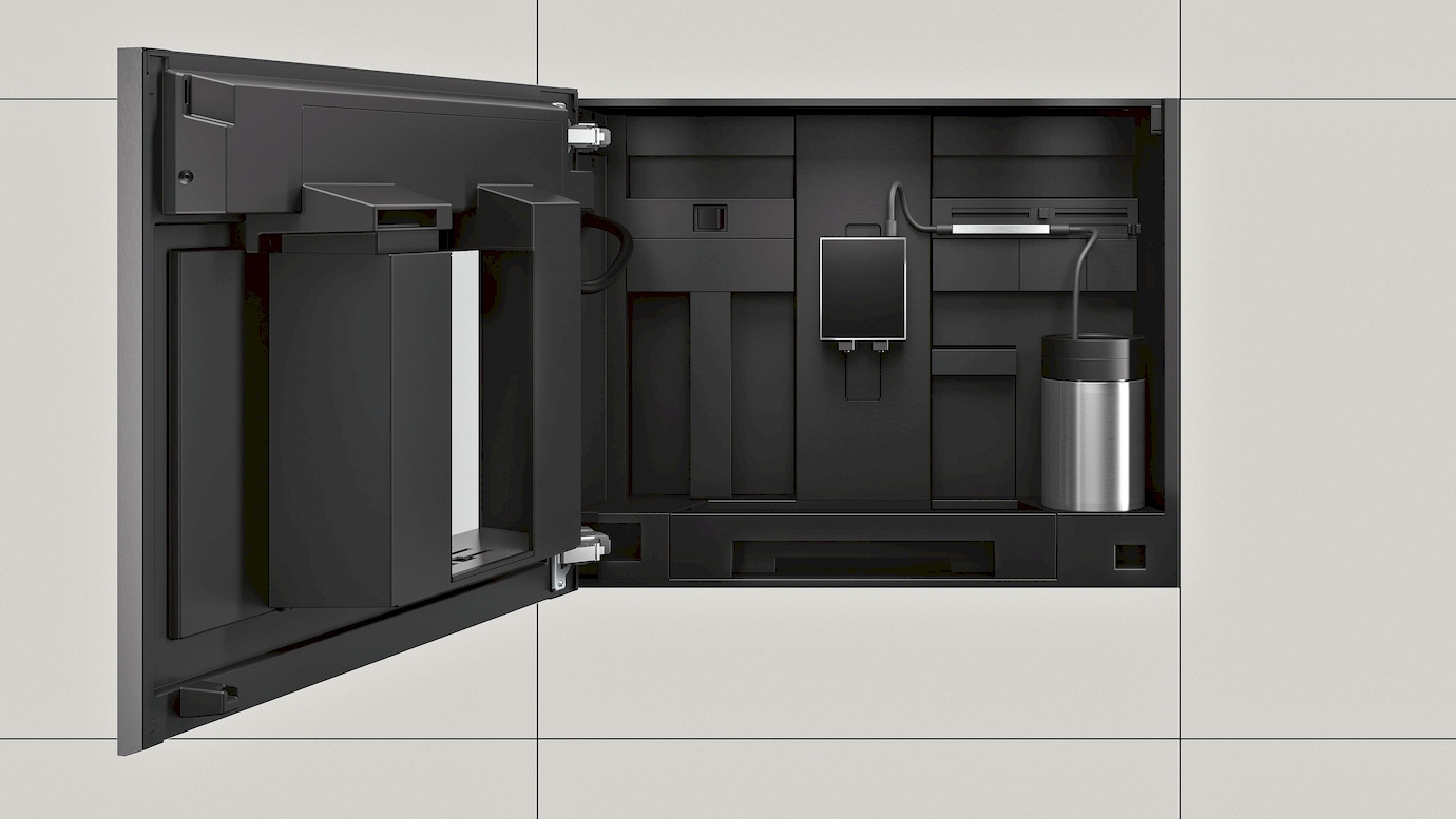 • Wasser-, Milch- und Bohnenbehälter sind leicht zugänglich hinter einer Tür versteckt, damit die Küche stets aufgeräumt ist