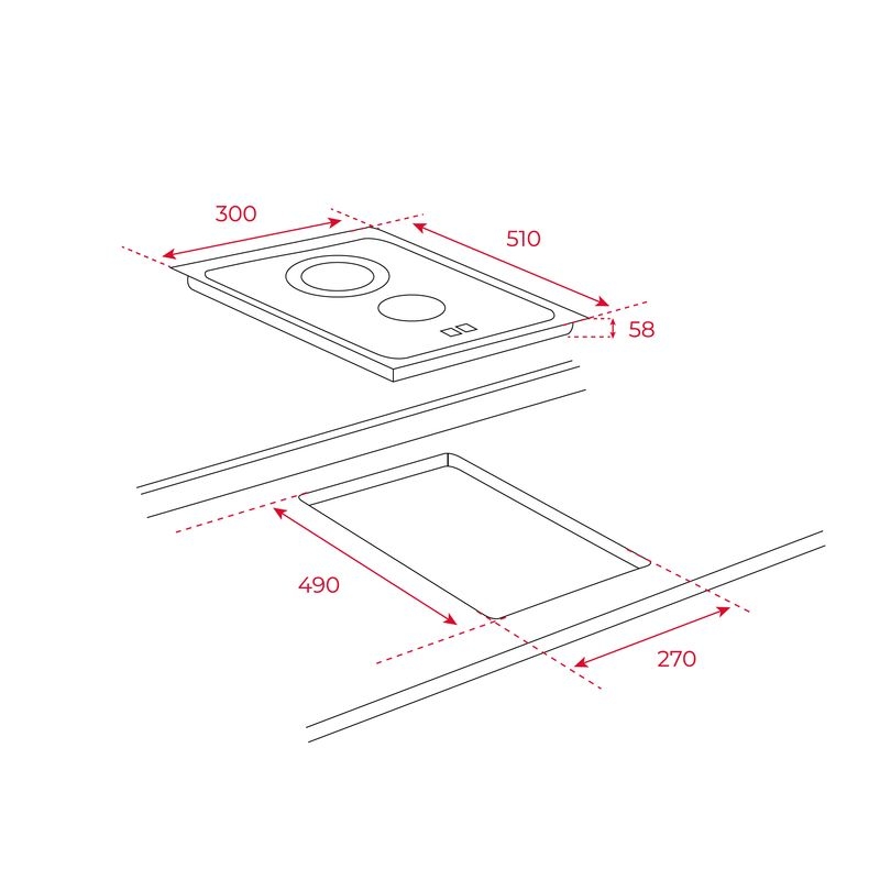 • Unter dem Kochfeld mind. 20 mm Freiraum lassen, um eine ausreichende Belüftung zu gewährleisten.