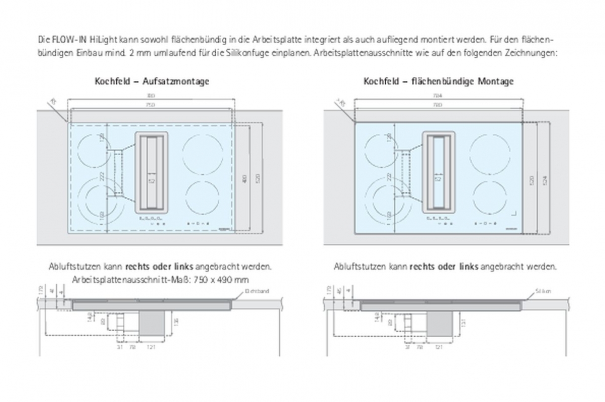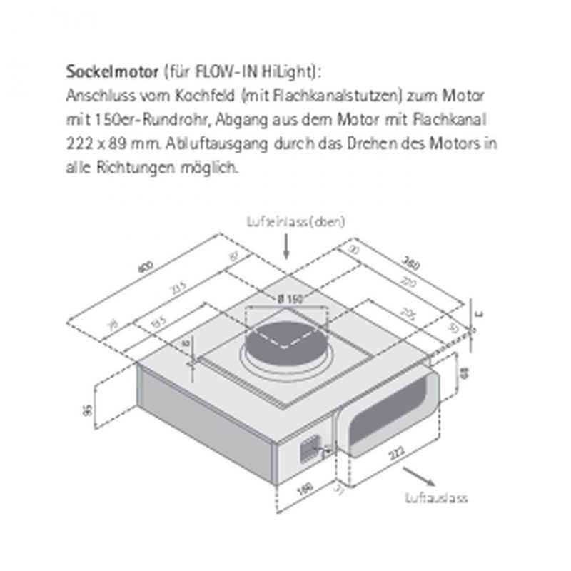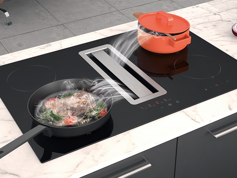 Der aufsteigende Dunst wird an den Außenkanten der Haubenkörperkonstruktion abgesaugt und zum dahinter liegenden Fettfilter geleitet. Bedingt durch die hohe Strömungsgeschwindigkeit am Rand der Dunsthaube kann selbst bei kleineren Motorstufen nahezu kein Kochdunst in die Küche entweichen. Es entstehen keine Turbulenzen, der Mitnahmeeffekt ist hoch und Abpralleffekte spielen keine Rolle. Die Luft strömt nicht erst in die Küche, sondern direkt in die Dunsthaube. Die aus der Randabsaugung resultierende Effizienzsteigerung ermöglicht den Betrieb in niedrigeren Leistungsstufen, mit weniger Energieverbrauch und geringerer Geräuschentwicklung.