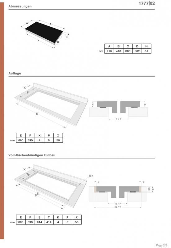 - Montagehinweis: Die Technik des Kochfelds muss für einen eventuellen Kundendiensteinsatz von unten komplett zugänglich sein, d.h. es dürfen keine einschränkenden Seiten, Traversen oder Rückwände die Entnahme der Technik nach unten verhindern oder erschweren. Dies gilt insbesondere bei flächenbündig silikonierten Kochfeldern.