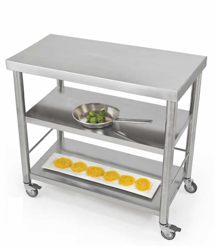 - Küchenwagen aus Edelstahl der Serie Auxilium mit zwei Ablagen ohne Schublade.