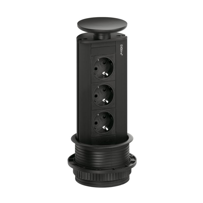 Energiebox. Versenkbar. Mit 3 Steckdosen für Hängeschränke oder Arbeitsplatten. Geführtes Herausziehen durch eine leicht zu drückende Taste, die auch beim Wiederverschließen die Leitung geordnet führt.