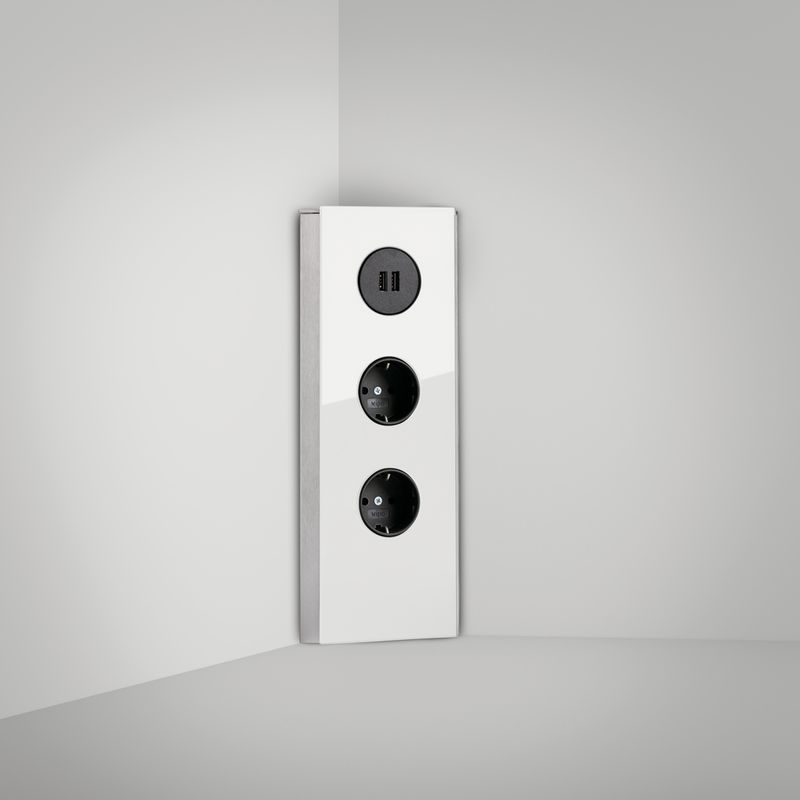 Eck-Steckdosenelement, 2-fach und Doppel USB Charger (Ladestation). Frontseite in bedrucktem und kratzfestem Glas, für 90° Ecke.
