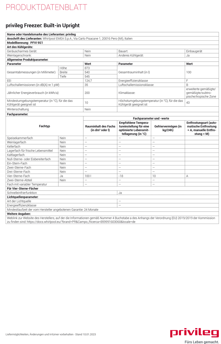 Privileg PFVI 9S1, Einbau Gefrierschrank, EEK: F