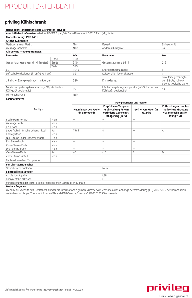 Privileg PRT 14S1, Einbau Kühl- Gefrierkombination, EEK: F