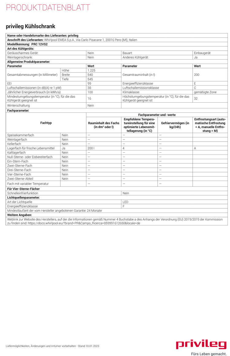 Privileg PRC 12VS2, Einbau Kühlschrank, EEK: E