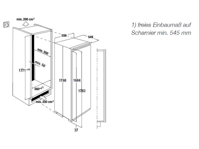 Bei der Festtürtechnik sind die Scharniere der Kühlschranktür am Gerät und an der Rückseite der Möbelfront befestigt.