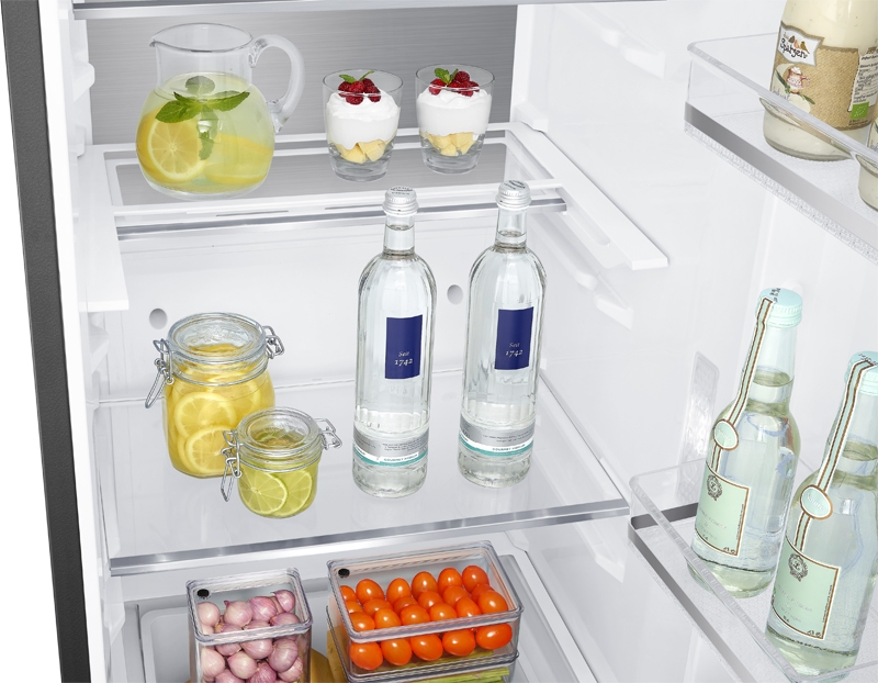 Mit dem praktischen herausnehmbaren Flaschenregal aus Edelstahl lagern Sie Ihre Lieblingsgetränke besonders platzsparend im Kühlschrank.