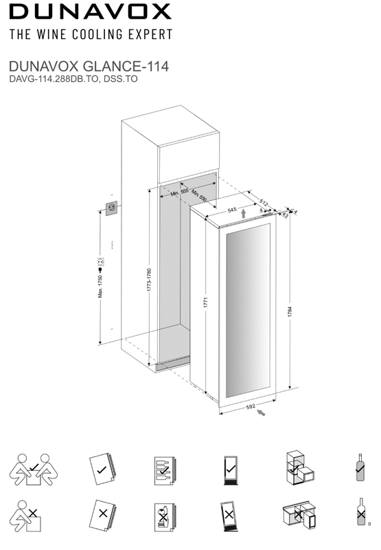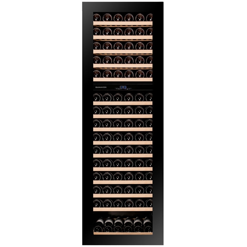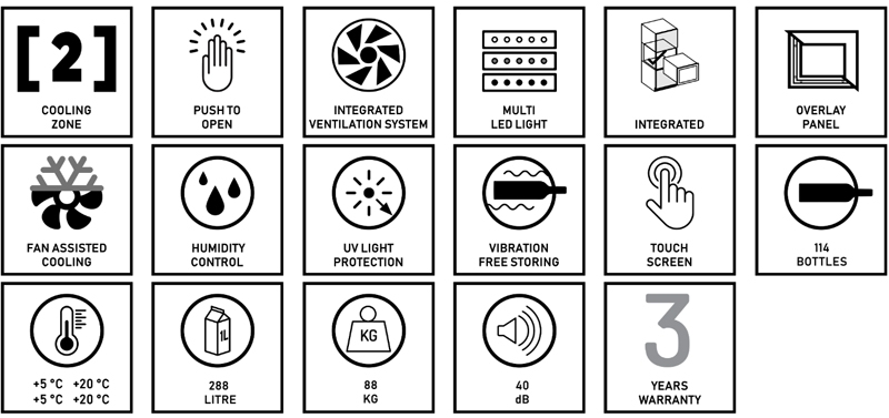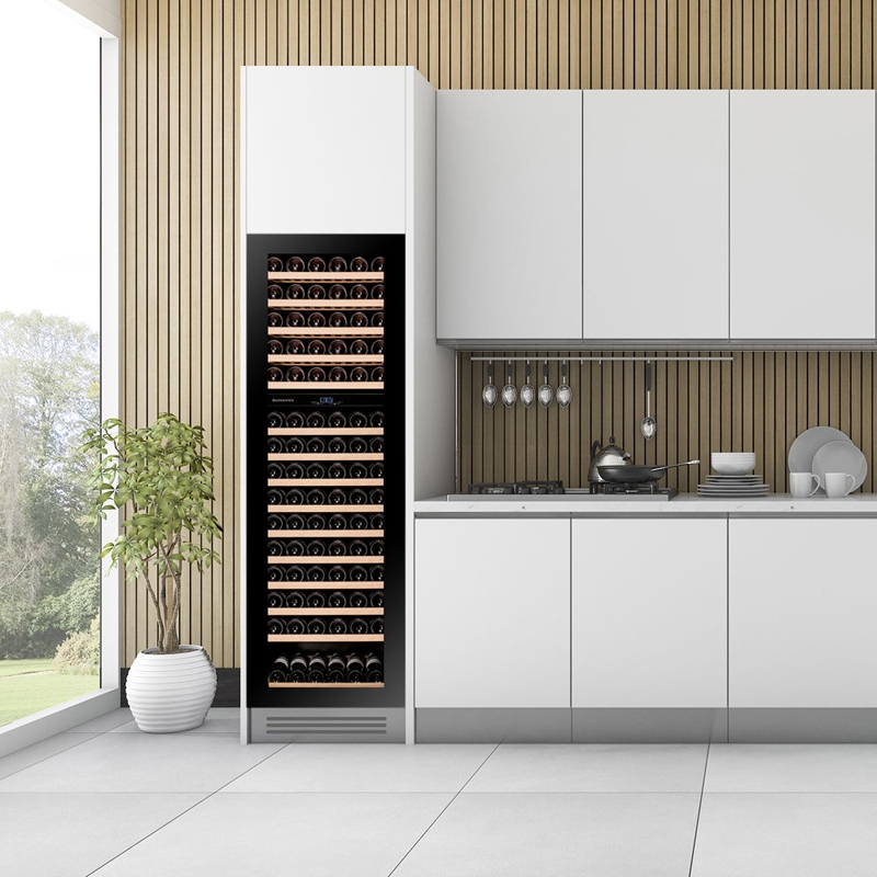 Zweizonen-Modell mit 114 Flaschen und integrierter Belüftung. Elegantes Erscheinungsbild, griffloses Design mit Push-to-Open-Technologie, ideal für jede moderne Küche. Die getönte Glastür kann geöffnet werden, indem Sie auf die Ecken der Tür drücken. Die Flaschen lagern auf massiven Buchenholzregalen und sind umgeben von warmweißer, kaltweißer oder blauer LED-Innenbeleuchtung. Bitte beachten Sie, dass dieses Modell eine integrierte Einheit für den Einbau oder die Installation unter der Theke ist und nicht als freistehender Weinkühler gedacht ist.