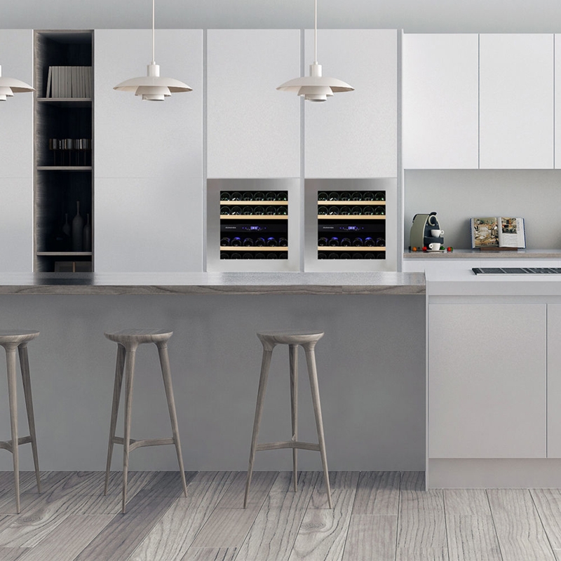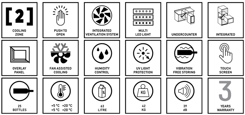Zweizonen-Modell mit 25 Flaschen und integrierter Belüftung. Elegantes Erscheinungsbild, griffloses Design mit Push-to-Open-Technologie, ideal für jede moderne Küche. Die getönte Glastür kann geöffnet werden, indem Sie auf die Ecken der Tür drücken. Die Flaschen lagern auf massiven Buchenholzregalen und sind umgeben von warmweißer, kaltweißer oder blauer LED-Innenbeleuchtung. Bitte beachten Sie, dass dieses Modell eine integrierte Einheit für den Einbau oder die Installation unter der Theke ist und nicht als freistehender Weinkühler gedacht ist.