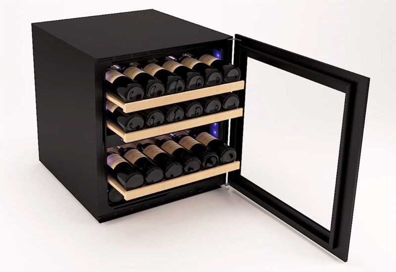 Weinkühlschrank für Rot- und Weißwein und Champagnerflaschen. Flaschen liegen auf ausziehbaren Holzeinlegeböden.