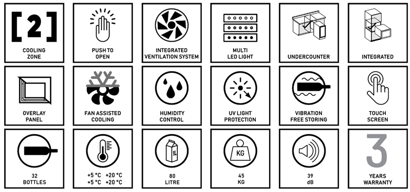 Zweizonen-Modell mit 32 Flaschen und integrierter Belüftung. Elegantes Erscheinungsbild, griffloses Design mit Push-to-Open-Technologie, ideal für jede moderne Küche. Die getönte Glastür kann geöffnet werden, indem Sie auf die Ecken der Tür drücken. Die Flaschen lagern auf massiven Buchenholzregalen und sind umgeben von warmweißer, kaltweißer oder blauer LED-Innenbeleuchtung. Bitte beachten Sie, dass dieses Modell eine integrierte Einheit für den Einbau oder die Installation unter der Theke ist und nicht als freistehender Weinkühler gedacht ist.
