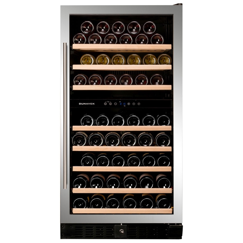 Ein freistehendes Modell mit 94 Flaschen und zwei Zonen aus der Grande Familie von Dunavox. Das SDSK-Modell verfügt über einen Griff aus Edelstahl und die schwarze Einheit über einen versenkten Griff. Der Grande-94 eignet sich perfekt für moderne Küchenumgebungen. Die Flaschen werden auf Holzregalen gelagert und von blauem LED-Licht umgeben. Bitte beachten Sie, dass dieses Modell für den freistehenden oder eingebauten Gebrauch geeignet ist.
