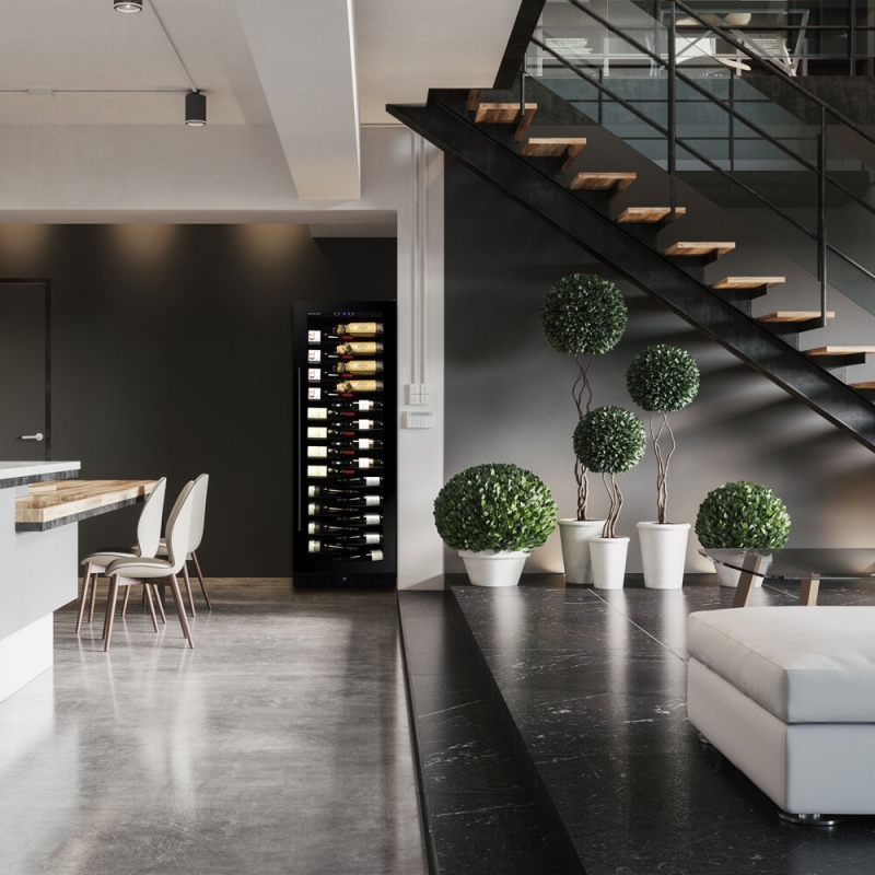 Weinkühlschrank für Rot- und Weißwein und Champagnerflaschen. Flaschen liegen auf ausziehbaren Holzeinlegeböden.