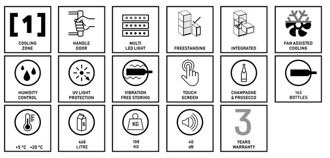 Ein freistehendes und einbaufähiges Modell mit einem Fassungsvermögen von 143 Flaschen aus dem exklusiven Sortiment von Dunavox. Das elegante Äußere des SS-Modells verfügt über einen Edelstahlgriff und die schwarze Einheit über einen schwarzen Griff. Der Grande-143 eignet sich perfekt für moderne Küchenumgebungen, Restaurants oder Hotels. Die Flaschen werden von Patentregalen gelagert, die in ein atemberaubendes hellblaues,weißes und amber Multi LED Interieur sind.