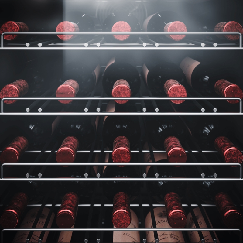 BESCHICHTETE WEINFLASCHENFÄCHER: Vierzehn beschichtete Flaschenfächer, die so geformt sind, dass sie jede Weinflasche sicher umschließen.