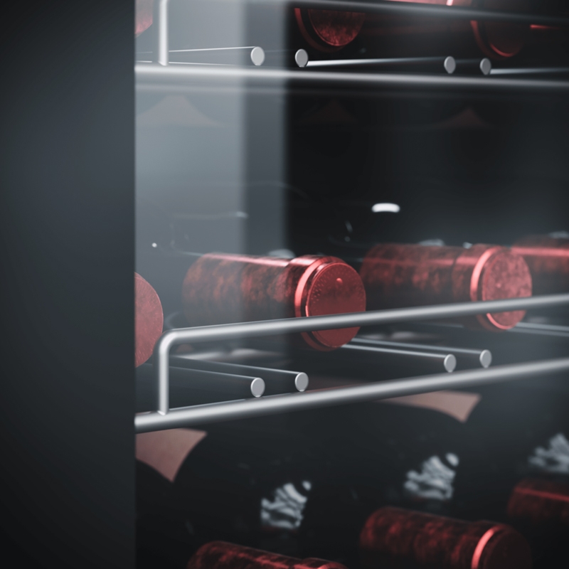 Dezentes, weißes LED-Licht beleuchtet sanft den Innenraum und hebt die Weinflaschen darin hervor