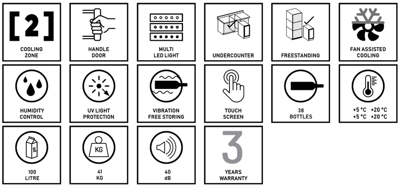 Unterbau-Modell mit zwei Temperaturzonen und einem Fassungsvermögen von 38 Flaschen, einem eleganten Äußeren, sowie einem Türgriff aus Edelstahl. Dieses Modell ist perfekt für zeitgenössische Küchenumgebungen geeignet. Die Flaschen lagern auf massiven Buchenholzregalen und sind umgeben von warmweißer, kaltweißer oder blauer LED-Innenbeleuchtung. Bitte beachten Sie, dass dieses Modell für den Unterbau und freistehend geeignet ist.