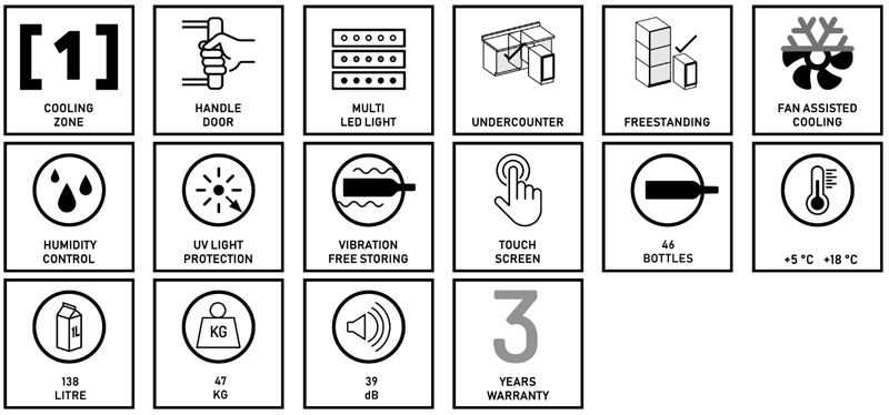 Unterbau-Modell mit einer Temperaturzone und einem Fassungsvermögen von 46 Flaschen, einem eleganten Äußeren, sowie einem Türgriff aus Edelstahl. Dieses Modell ist perfekt für zeitgenössische Küchenumgebungen geeignet. Die Flaschen lagern auf massiven Buchenholzregalen und sind umgeben von warmweißer, kaltweißer oder blauer LED-Innenbeleuchtung. Bitte beachten Sie, dass dieses Modell für den Unterbau und freistehend geeignet ist.