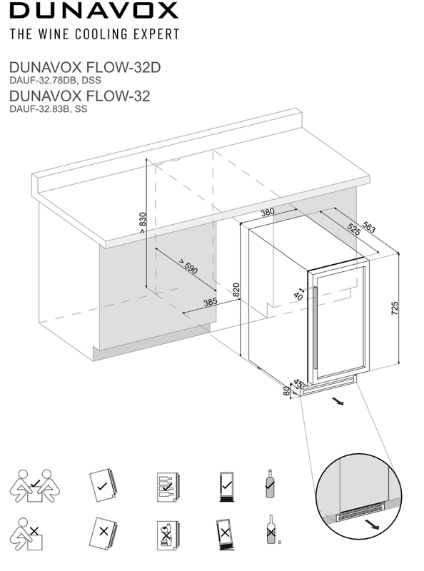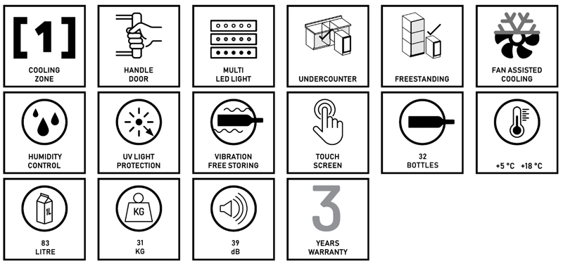 Unterbau-Modell mit einer Temperaturzone und einem Fassungsvermögen von 32 Flaschen, einem eleganten Äußeren, sowie einem Türgriff aus Edelstahl. Dieses Modell ist perfekt für zeitgenössische Küchenumgebungen geeignet. Die Flaschen lagern auf massiven Buchenholzregalen und sind umgeben von warmweißer, kaltweißer oder blauer LED-Innenbeleuchtung. Bitte beachten Sie, dass dieses Modell für den Unterbau und freistehend geeignet ist.
