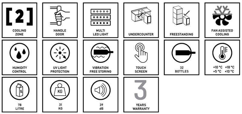 Unterbau-Modell mit zwei Temperaturzonen und einem Fassungsvermögen von 32 Flaschen, einem eleganten Äußeren, sowie einem Türgriff aus Edelstahl. Dieses Modell ist perfekt für zeitgenössische Küchenumgebungen geeignet. Die Flaschen lagern auf massiven Buchenholzregalen und sind umgeben von warmweißer, kaltweißer oder blauer LED-Innenbeleuchtung. Bitte beachten Sie, dass dieses Modell für den Unterbau und freistehend geeignet ist.