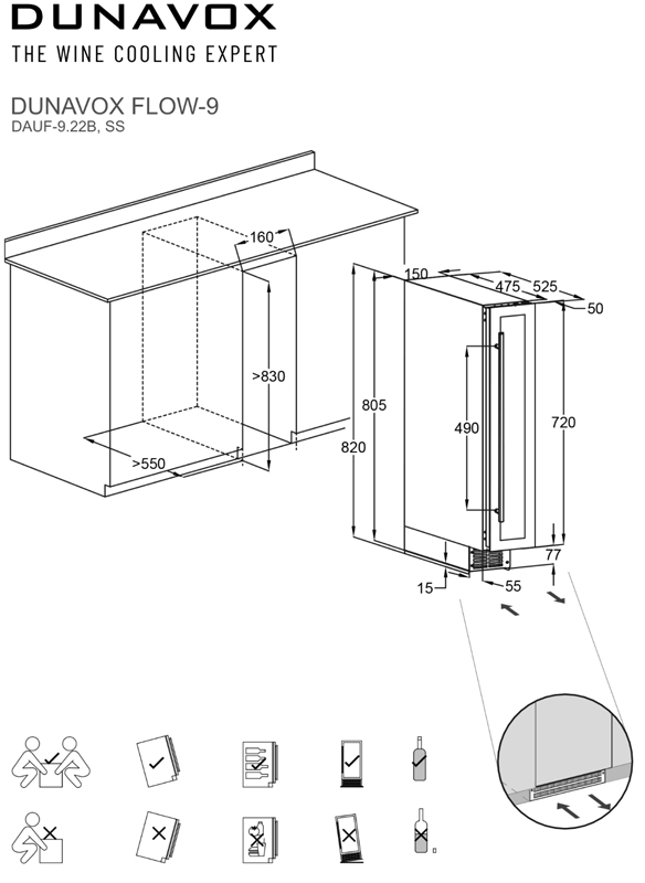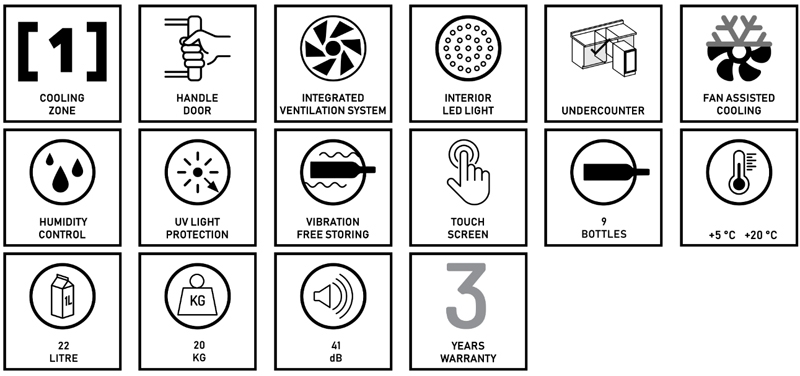 Eine Weiterentwicklung des Modells DX-7.20, welches jetzt eine größere Kapazität von 9 Bordeaux-Flaschen aufweist. Erhältlich in Schwarz und Edelstahl. Dieses Modell ist ideal für moderne Küchen mit begrenztem Platzangebot. Die Flaschen werden auf fixen Regalen gelagert, die in einem weiß beleuchteten Innenraum eingebettet sind. Bitte beachten Sie, dass dieses Modell als eingebaute Unterbaueinheit gedacht ist.