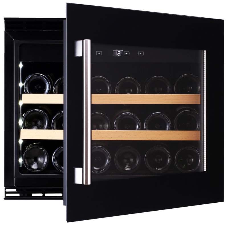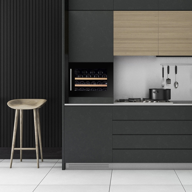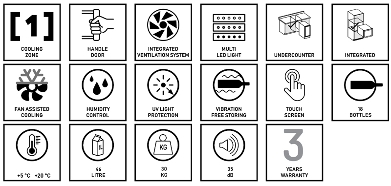 Integrierbares Modell mit einem Verfassungsvermögen von 18 Flaschen mit einer Zone und integrierter Belüftung. Mit dem eleganten Äußeren und einem Türgriff aus Edelstahl eignet sich dieses Modell perfekt für moderne Küchenumgebungen. Die Flaschen lagern auf massiven Buchenholzregalen und sind umgeben von warmweißer, kaltweißer oder blauer LED-Innenbeleuchtung. Bitte beachten Sie, dass dieses Modell eine integrierte Einheit ist, die für den Einbau oder die Installation auch unter der Theke konzipiert wurde und nicht als freistehender Weinkühler gedacht ist.