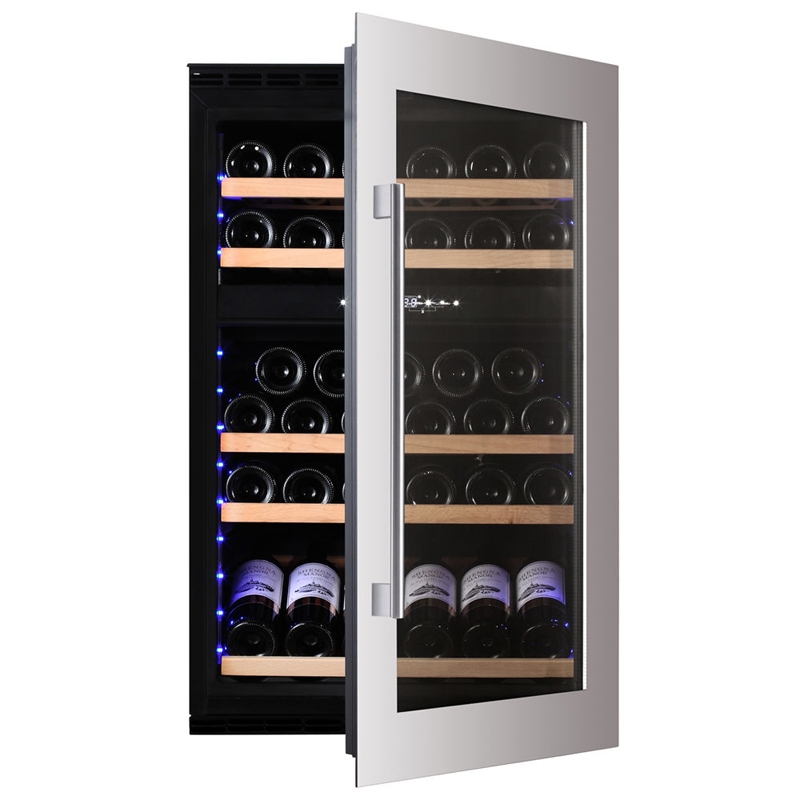 Integrierbares Modell mit einem Verfassungsvermögen von 49 Flaschen mit zwei Temperaturzonen und integrierter Belüftung. Mit dem eleganten Äußeren und einem Türgriff aus Edelstahl eignet sich dieses Modell perfekt für moderne Küchenumgebungen. Die Flaschen lagern auf massiven Buchenholzregalen und sind umgeben von warmweißer, kaltweißer oder blauer LED-Innenbeleuchtung. Bitte beachten Sie, dass dieses Modell eine integrierte Einheit ist, die für den Einbau oder die Installation auch unter der Theke konzipiert wurde und nicht als freistehender Weinkühler gedacht ist.