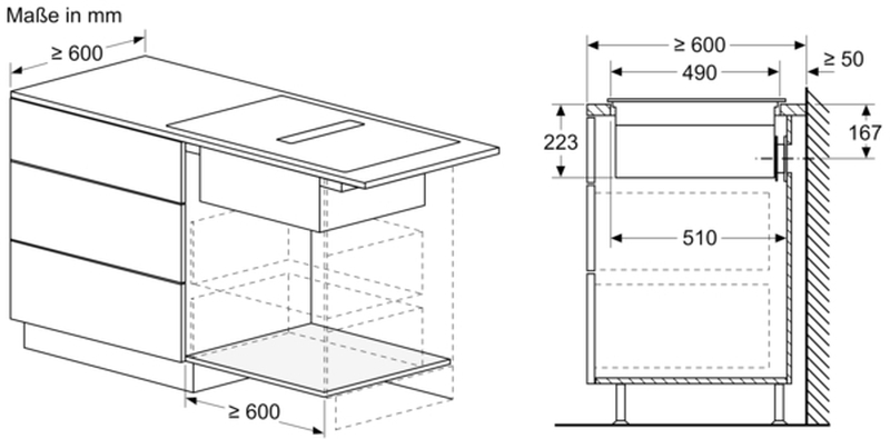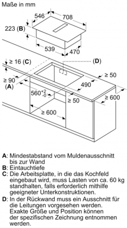 • Bei Betrieb in teil/vollgeführter Umluft oder Abluft zwingend das entsprechende Set für ≥60 cm oder ≥70 cm Arbeitsplattentiefe bestellen.
