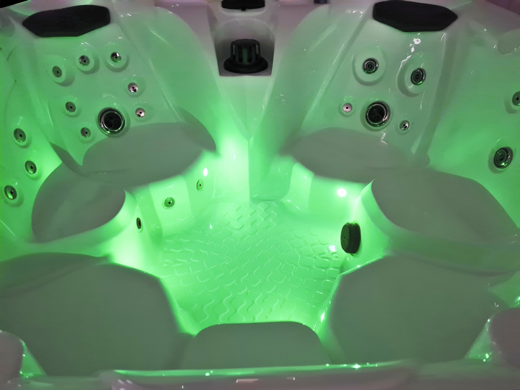 Mit dem speziellen LED-Beleuchtungssystem, das ein sanftes Umgebungslicht erzeugt, wird jeder "Besuch" im eigenen Spa zum Vergnügen. Die Kopfstützen sind hintergrundbeleuchtet und auch im Becken finden sich einzelne Unterwasserleuchten. Das Gehäuse hat ebenfalls an jeder Ecke eine externe LED-Beleuchtung. Das Beleuchtungssystem ist miteinander verbunden und Sie können zwischen automatischem Farbwechsel oder einer Farbe wählen.