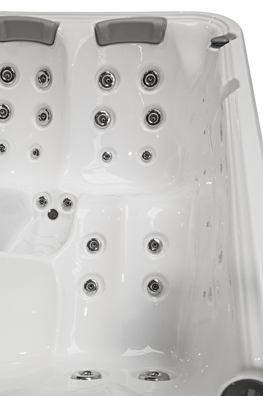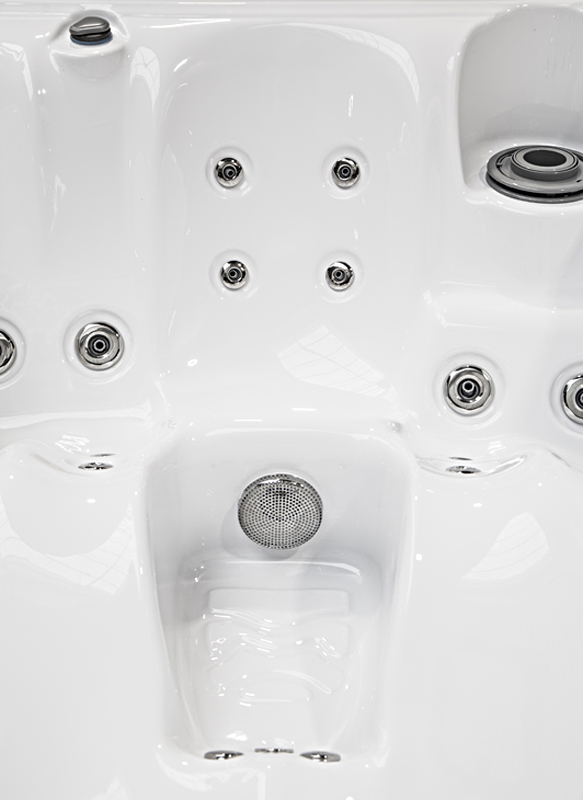 Das Whirlpool Spa hat spezielle, nach unten gerichtete Nacken- und Schulterdüsen. Im Bereich des Rumpfes sind ergonomisch angelegte Massagedüsen vorhanden und bei den Liegeplätzen finden sich im Bereich der Unterschenkel spezielle Düsen zur Wadenmassage für eine perfekte Entspannung der Beinmuskulatur. Ebenso ist jeder Sitz im Spa mit einer anderen Düsenanordnung ausgestattet, damit jeder seinen eigenen Favoriten finden kann.