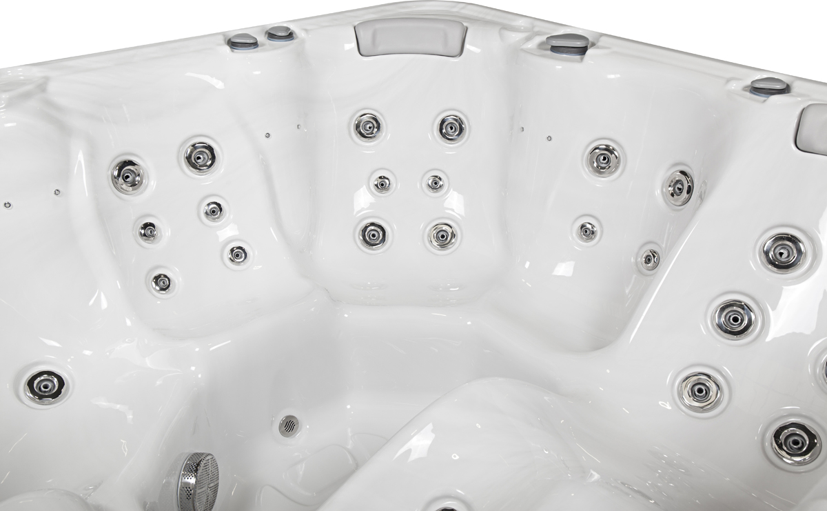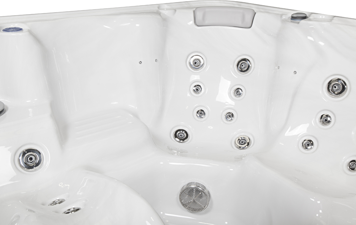 Das Whirlpool Spa hat spezielle, nach unten gerichtete Nacken- und Schulterdüsen. Im Bereich des Rumpfes sind ergonomisch angelegte Massagedüsen vorhanden und bei dem Liegeplatz finden sich im Bereich der Unterschenkel spezielle Düsen zur Wadenmassage für eine perfekte Entspannung der Beinmuskulatur. Genießen Sie Entspannung und Muskeldehnung in Ihrem eigenen Spa. Nebenbei können die ergonomisch gestalteten Massagedüsen an den Unterseiten der Sitzen gegen Cellulitis helfen.