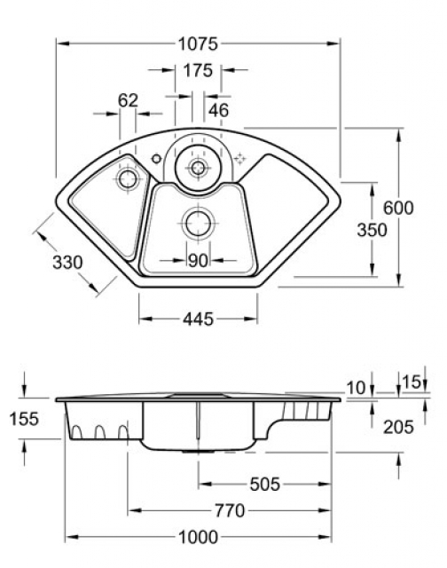 - Spülenmaße: L x B 1075 x 600 mm