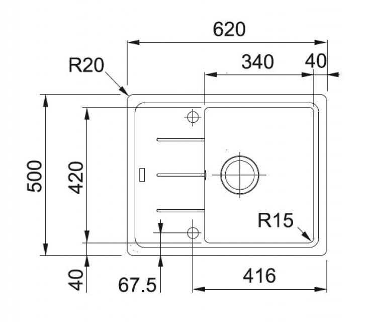 • Großes Becken mit engem Eckradius