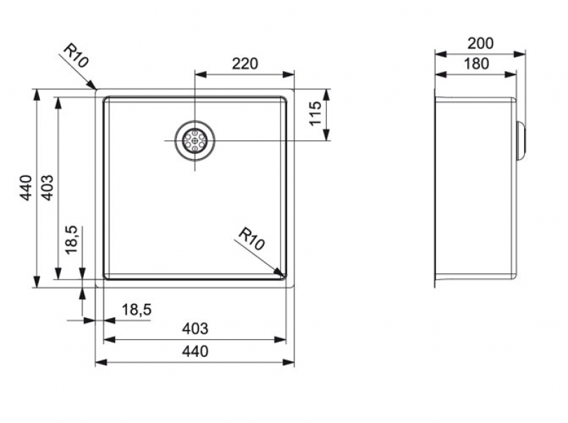 • Abmessung der Spüle: 406 x 403 mm