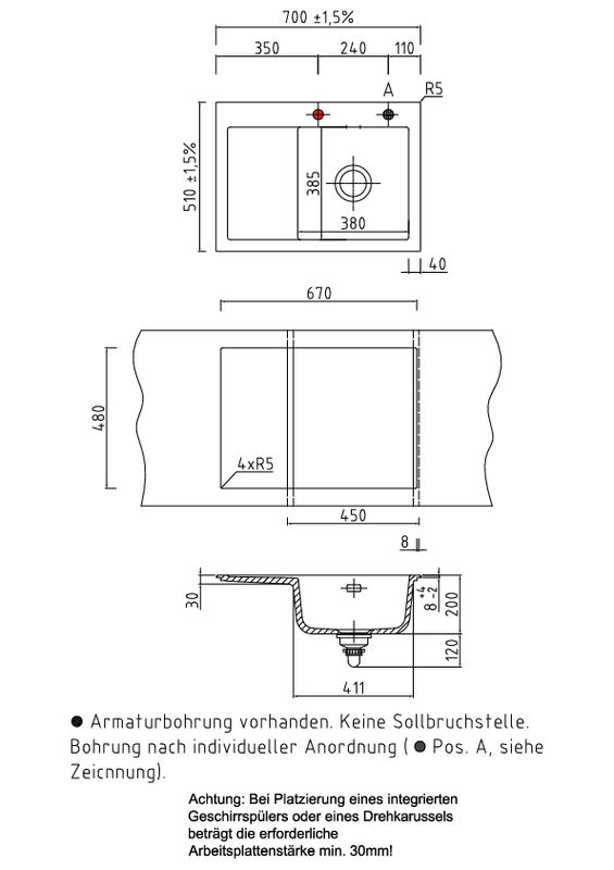 • Der Auslieferungszustand der Spüle beinhaltet eine Lochbohrung für die Armatur. Es sind keine Sollbruchstellen vorhanden; eine oder weitere Durchbohrung(en) kann nur im Werk des Herstellers Systemceram vorgenommen werden. Bitte geben Sie uns dafür exakt die von Ihnen gewünschte Position auf der Spüle an, gern auch anhand einer separaten Email, oder nehmen Sie diesbezüglich mit uns Kontakt auf. Bitte beachten Sie auch, daß Sie durch diese persönliche Positionierung der Lochbohrung einen für Sie individualisierten Artikel bestellen und erwerben, der nur für Sie speziell angefertigt wird. Diese Individualisierung und die damit verbundene nicht gegebene Möglichkeit eines anderweitigen Verkaufes durch uns kann zu einem Nicht-Wirksamwerden des Widerrufrechtes führen, welches individualisierte Produkte ausdrücklich ausnimmt. (Auf eine mit Produktmängeln zusammenhängende Reklamation hat dies selbstverständlich keinen Einfluß). Bitte sprechen Sie uns ggfs. hierauf an.