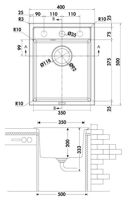 • Einbauspüle. Composite, Einzelbecken. 3½" Siebkorbventil mit Drehexzentergarnitur, verchromt. 3 Vorbohrungen