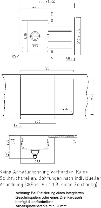 - Diese Spüle verfügt über 2 Möglichkeiten für Lochbohrungen. Diese können nur mit Spezial-Werkzeug des Herstellers vorgenommen werden! Ein Durchbohren vor Ort, auch durch Fachbetriebe, ist nicht möglich!