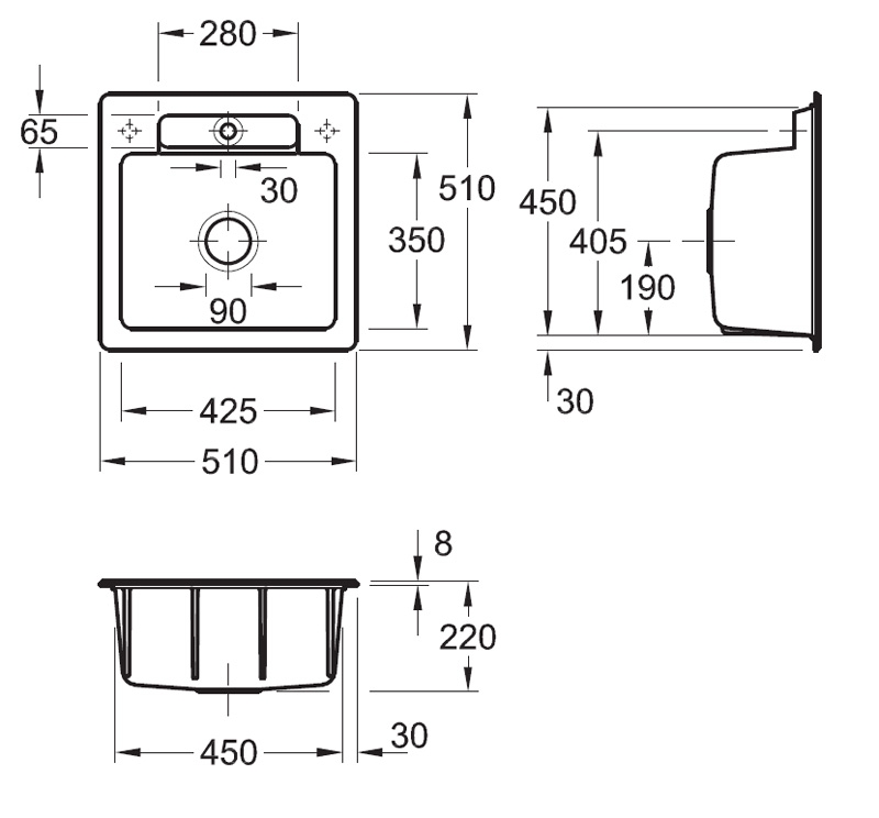 - Aussparung der Arbeitsplatte 480 x 480 mm