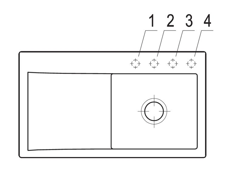 Option "Lochbohrungen durch Hersteller": Wenn Sie wünschen, dass aus Sicherheitsgründen die Lochbohrungen werksseitig vom Hersteller vorgenommen werden sollen, wählen Sie bitte diese Option. Hierfür benötigen wir von Ihnen die Nummern/Positionen des Hahnlochs/der Hahnlöcher, die V & B für Sie durchbohren soll. Bei der Spülenversion mit Handbetätigung benötigen Sie 1 Hahnlochbohrung für die Armatur, bei der Version mit Excenterbetätigung benötigen Sie 2 Lochbohrungen (Armatur und Excenter-Bedienung). Bitte beachten Sie hierzu die unten abgebildeten Maßzeichnungen, da die Positionen der Lochbohrungen bei reversiblen Spülen für die Becken-links und Becken-rechts-Versionen unterschiedlich sein können.