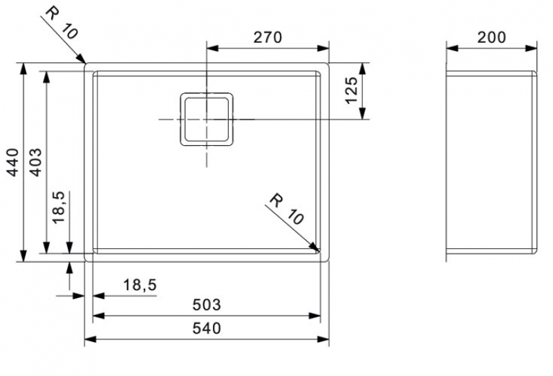 Einbau/Auflage-Spüle, Rechteckiges Korbventil, 10mm Radius