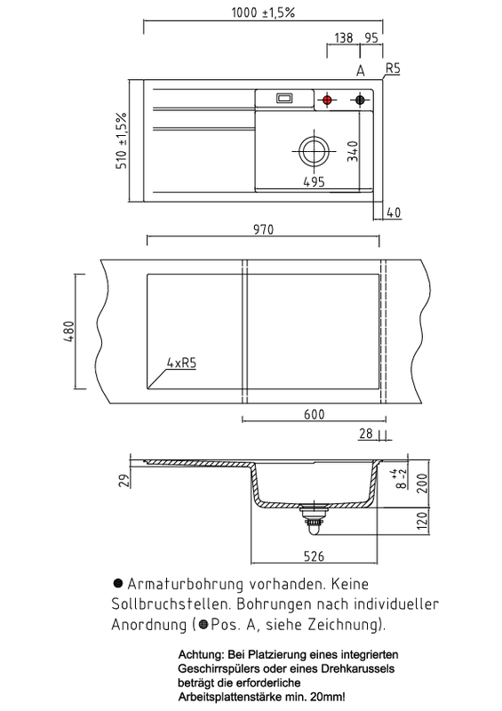 • Der Auslieferungszustand der Spüle beinhaltet eine Lochbohrung für die Armatur. Die zusätzliche(n) Lochbohrung(en) sind verschlossen und müssen werksseitig vom Hersteller vorgenommen werden, wird dafür 12,-- Euro pro Spüle berechnet