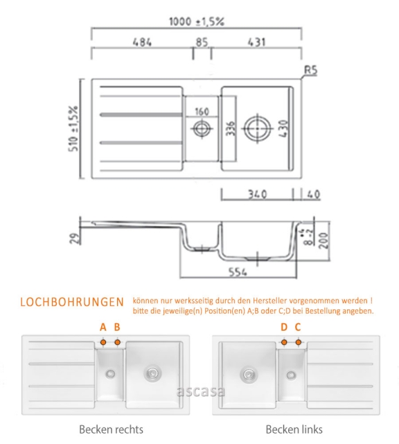 Bitte geben Sie uns dafür die von Ihnen gewünschte(n) Position(en) für eine oder mehrere Lochbohrungen auf der Spüle an oder nehmen Sie diesbezüglich mit uns Kontakt auf. Bitte beachten Sie auch, daß Sie durch diese persönliche Positionierung der Lochbohrung einen für Sie individualisierten Artikel bestellen und erwerben, der nur für Sie speziell angefertigt wird. Diese Individualisierung und die damit verbundene nicht gegebene Möglichkeit eines anderweitigen Verkaufes durch uns kann zu einem Nicht-Wirksamwerden des Widerrufrechtes führen, welches individualisierte Produkte ausdrücklich ausnimmt. (Auf eine mit Produktmängeln zusammenhängende Reklamation hat dies selbstverständlich keinen Einfluß). Bitte sprechen Sie uns ggfs. hierauf an. - Ausschnittmaß in der Arbeitsplatte: 980 X 490 mm