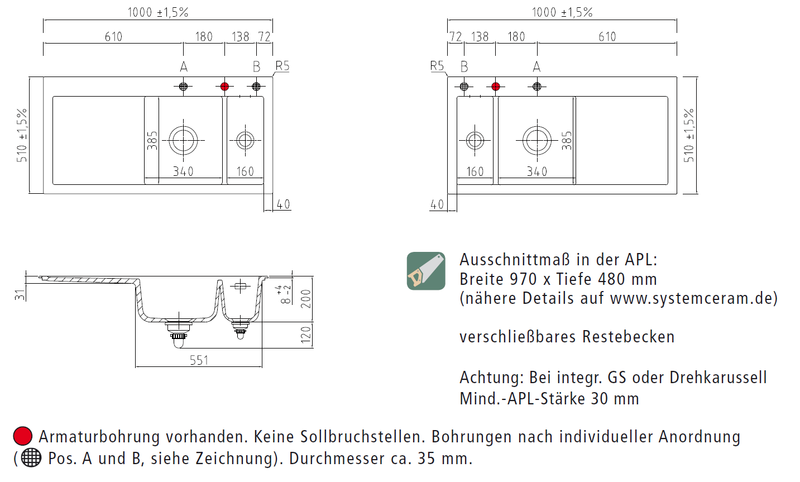 • Der Auslieferungszustand der Spüle beinhaltet eine Lochbohrung für die Armatur. Es sind keine Sollbruchstellen vorhanden; eine oder weitere Durchbohrung(en) kann nur im Werk des Herstellers Systemceram vorgenommen werden. Bitte geben Sie uns dafür exakt die von Ihnen gewünschte Position auf der Spüle an, gern auch anhand einer separaten Email, oder nehmen Sie diesbezüglich mit uns Kontakt auf. Bitte beachten Sie auch, daß Sie durch diese persönliche Positionierung der Lochbohrung einen für Sie individualisierten Artikel bestellen und erwerben, der nur für Sie speziell angefertigt wird. Diese Individualisierung und die damit verbundene nicht gegebene Möglichkeit eines anderweitigen Verkaufes durch uns kann zu einem Nicht-Wirksamwerden des Widerrufrechtes führen, welches individualisierte Produkte ausdrücklich ausnimmt. (Auf eine mit Produktmängeln zusammenhängende Reklamation hat dies selbstverständlich keinen Einfluß). Bitte sprechen Sie uns ggfs. hierauf an.