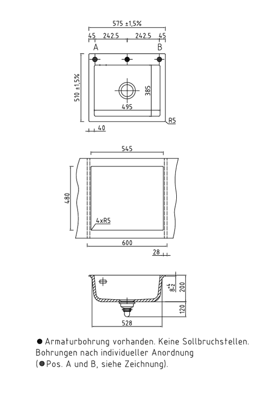 • Der Auslieferungszustand der Spüle beinhaltet eine Lochbohrung für die Armatur. Es sind keine Sollbruchstellen vorhanden; eine oder weitere Durchbohrung(en) kann nur im Werk des Herstellers Systemceram vorgenommen werden. Bitte geben Sie uns dafür exakt die von Ihnen gewünschte Position auf der Spüle an, gern auch anhand einer separaten Email, oder nehmen Sie diesbezüglich mit uns Kontakt auf. Bitte beachten Sie auch, daß Sie durch diese persönliche Positionierung der Lochbohrung einen für Sie individualisierten Artikel bestellen und erwerben, der nur für Sie speziell angefertigt wird. Diese Individualisierung und die damit verbundene nicht gegebene Möglichkeit eines anderweitigen Verkaufes durch uns kann zu einem Nicht-Wirksamwerden des Widerrufrechtes führen, welches individualisierte Produkte ausdrücklich ausnimmt. (Auf eine mit Produktmängeln zusammenhängende Reklamation hat dies selbstverständlich keinen Einfluß). Bitte sprechen Sie uns ggfs. hierauf an.
