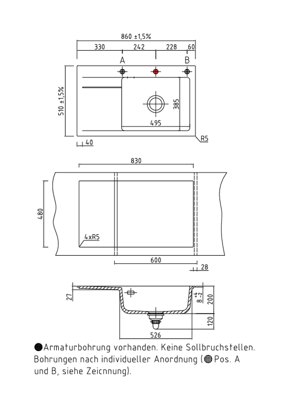 • Der Auslieferungszustand der Spüle beinhaltet eine Lochbohrung für die Armatur. Es sind keine Sollbruchstellen vorhanden; eine oder weitere Durchbohrung(en) kann nur im Werk des Herstellers Systemceram vorgenommen werden. Bitte geben Sie uns dafür exakt die von Ihnen gewünschte Position auf der Spüle an, gern auch anhand einer separaten Email, oder nehmen Sie diesbezüglich mit uns Kontakt auf. Bitte beachten Sie auch, daß Sie durch diese persönliche Positionierung der Lochbohrung einen für Sie individualisierten Artikel bestellen und erwerben, der nur für Sie speziell angefertigt wird. Diese Individualisierung und die damit verbundene nicht gegebene Möglichkeit eines anderweitigen Verkaufes durch uns kann zu einem Nicht-Wirksamwerden des Widerrufrechtes führen, welches individualisierte Produkte ausdrücklich ausnimmt. (Auf eine mit Produktmängeln zusammenhängende Reklamation hat dies selbstverständlich keinen Einfluß). Bitte sprechen Sie uns ggfs. hierauf an.