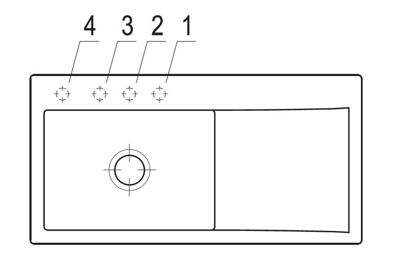 Option "Lochbohrungen durch Hersteller": Wenn Sie wünschen, dass aus Sicherheitsgründen die Lochbohrungen werksseitig vom Hersteller vorgenommen werden sollen, wählen Sie bitte diese Option. Hierfür benötigen wir von Ihnen die Nummern/Positionen des Hahnlochs/der Hahnlöcher, die V & B für Sie durchbohren soll. Bei der Spülenversion mit Handbetätigung benötigen Sie 1 Hahnlochbohrung für die Armatur, bei der Version mit Excenterbetätigung benötigen Sie 2 Lochbohrungen (Armatur und Excenter-Bedienung). Bitte beachten Sie hierzu die unten abgebildeten Maßzeichnungen, da die Positionen der Lochbohrungen bei reversiblen Spülen für die Becken-links und Becken-rechts-Versionen unterschiedlich sein können.