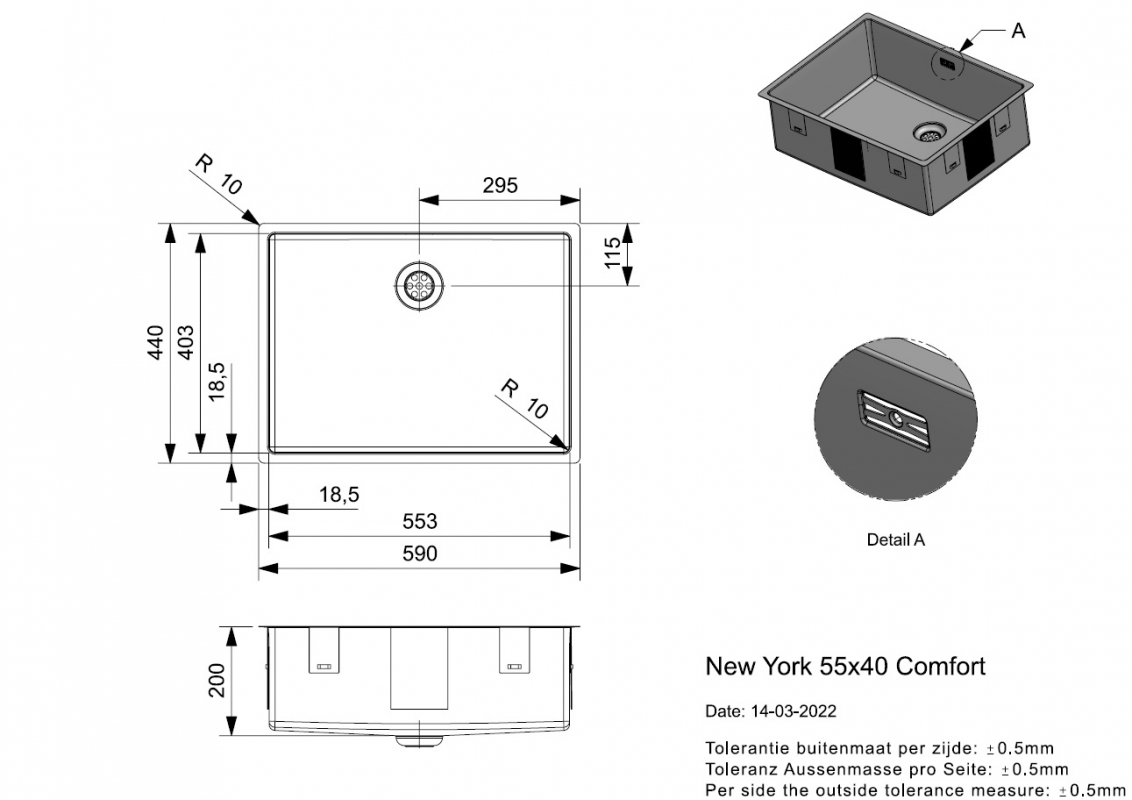 Die Reginox New York 55 x 40 kann sowohl als Einbau-/Auflage-Spüle als auch als Unterbauspüle oder als flächenbündige Spüle eingebaut werden.