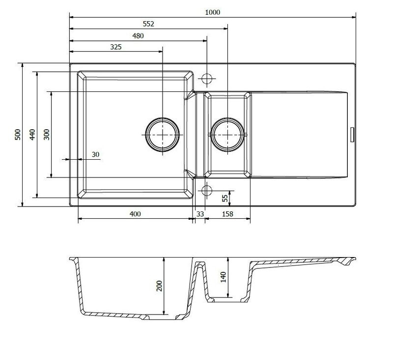 • Abmessung der Spüle: 400 x 440 + 158 x 300 mm