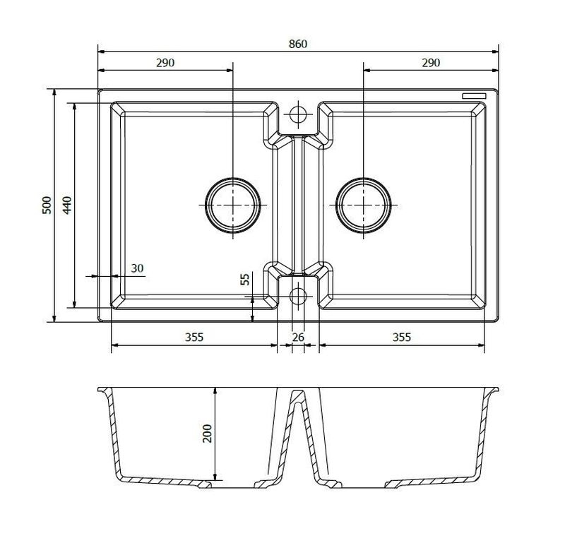 • Abmessung der Spüle: 355 x 440 + 355 x 440 mm